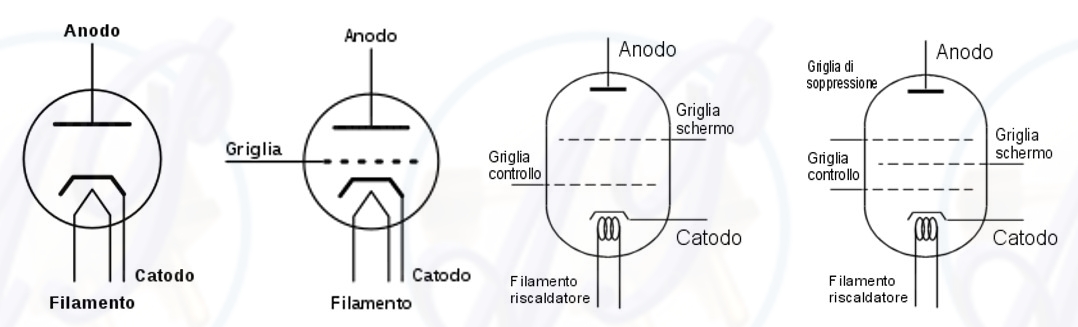 Triodi - In confronto ai diodi hanno un elettrodo in più, la griglia di controllo, che consente di regolare opportunamente la corrente di elettroni che passa tra catodo e anodo (corrente anodica).